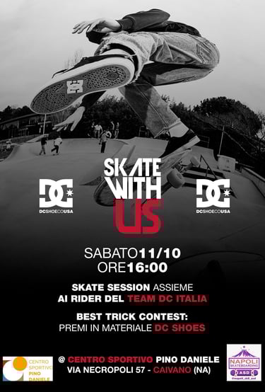 Sabato 11 ottobre lo skatepark del Centro Pino Daniele è stato teatro di un evento fantastico! il team DC Italia è venuto a farci visita ed ha scelto la nostra Skate School come partner ufficiale dell'evento! l'evento è stato uno spettacolo, ma la cosa ancor più bella è stata l'atmosfera rilassata che si respirava. Dopo la dimostrazione dei professionisti DC Shoes si è svolto anche un contest con la formula super collaudata "Best Trick", ben 3 premi su 5 sono andati ai ragazzi del nostro team!